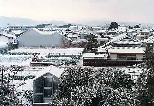 今はなき実家(自室)から撮った雪景色(もちろん受験時のものではない)。 おおっ、雪が積もってる……アッ、ちょうどカメラにフィルム入ってるぞ、 というのでシャッターを切ったもの。現在は耕作地(夏場は水田の二毛作) が消滅し戸建て住宅がぎっしり。目立つ現存家屋のみ加工しておいた。 |
